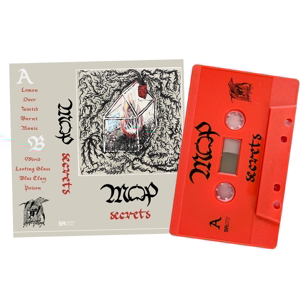 Pro-printed & pro-duplicated blood red cassettes w/ black imprint including a full color double sided J-card housed in clear cases in shrink wrap.